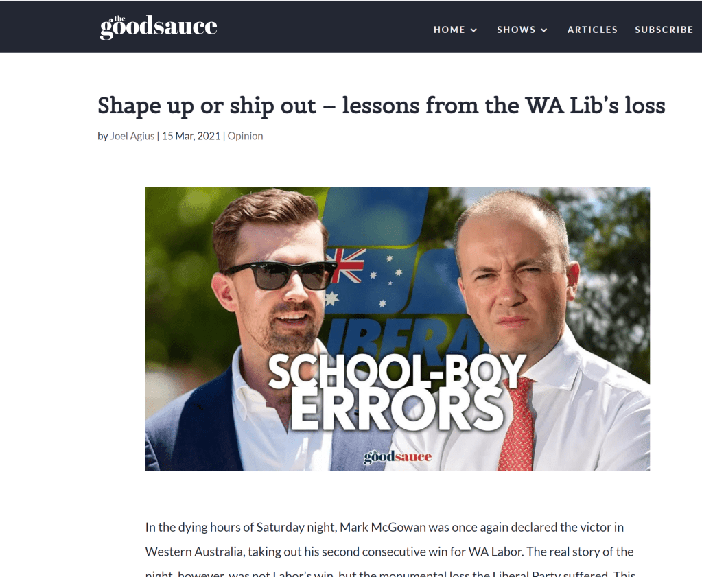 Read my latest for The Good Sauce here. An analysis on what went wrong for the Libs at the WA Election, and the lessons they must learn on a nationwide level.